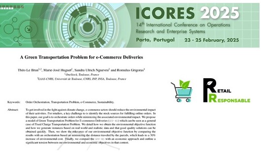 Présentation par Théo Le Brun lors de ICORES 2025 (Porto) de ses travaux sur le Green Transportation Problem for E-commerce Deliveries.