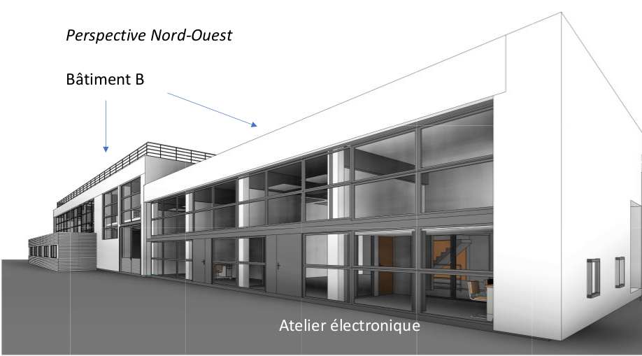 - Enfin, la rénovation du bâtiment B comprendra l’isolation du bâtiment par l’extérieur, le changement des fenêtres et la mise en place de protections pare-soleil. Une consolidation du plancher est prévue avant rénovation de l’intérieur du bâtiment (éclairage LED, lumière naturelle, amélioration de la qualité de vite)