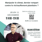 Le LAAS a le plaisir d’accueillir Roland Séférian, chercheur Météo-France au Centre national de recherches météorologiques (CNRM) et l’un des meilleurs spécialistes en sciences du climat actuel, il a notamment participé en tant qu’auteur au rapport spécial 1,5°C du GIEC de 2018. Manipuler le climat, dernier rempart contre le réchauffement planétaire ? Face au réchauffement climatique […]